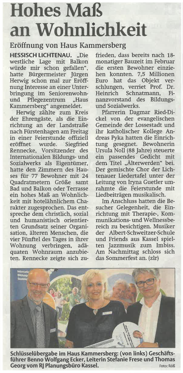 Pressetext aus der „HNA- Werra-Meißner-Kreis“ vom 13.06.2016 zur Eröffnung Pflegeheim Hessisch Lichtenau