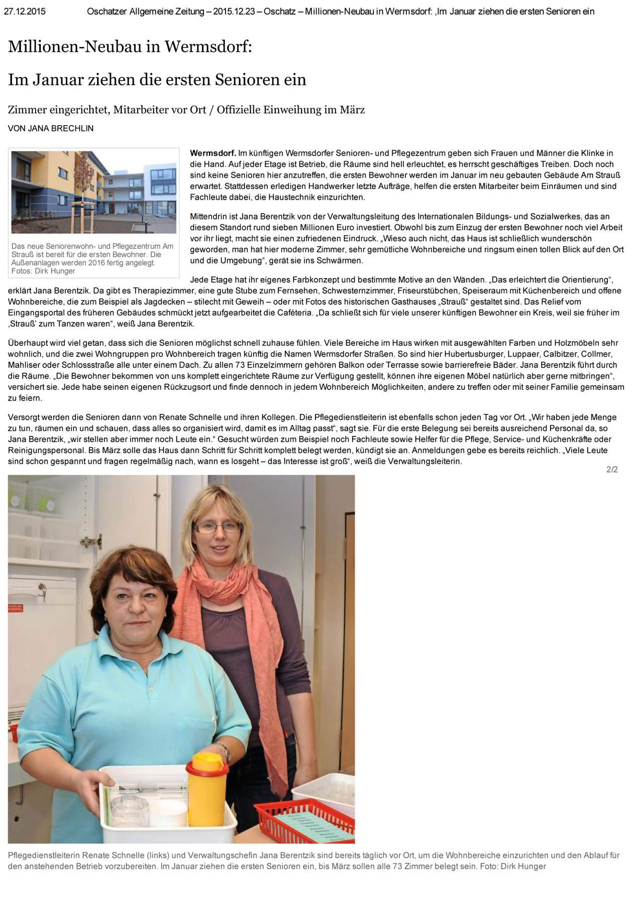 Pressemitteilung der Oschatzer Allgemeinen Zeitung vom 27. Dezember 2015 zur Fertigstellung des Pflegeheimes in Wermsdorf mit Erstbezug im Januar 2016: