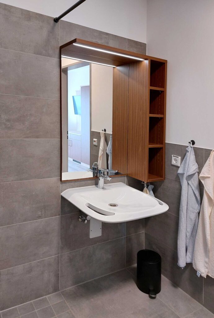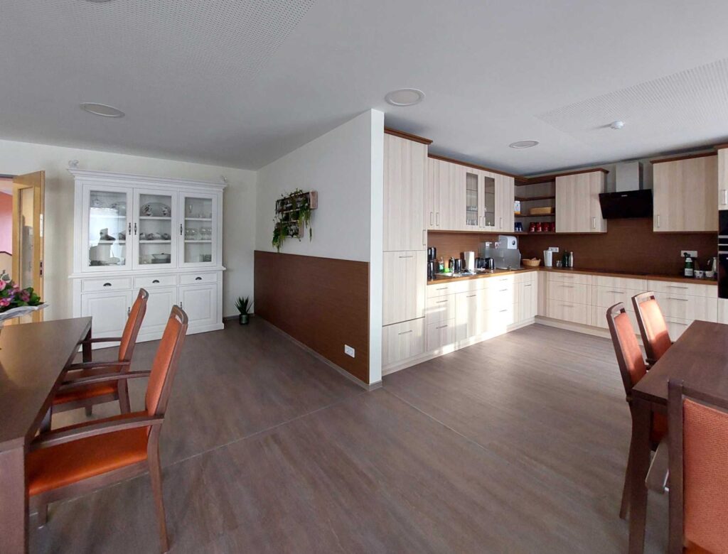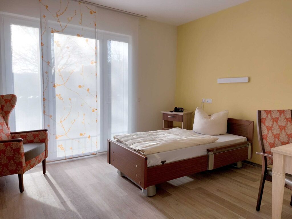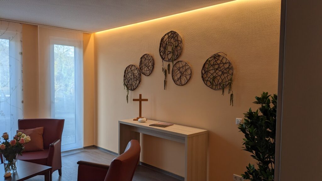 Dadurch ist das Obergeschoss direkt an die Straße angeschlossen. So sind die Gästezimmer, der Gemeinschaftsbereich, sowie die Räume zur Entspannung und des Abschiedes ebenerdig über den Flur bei der Einfahrt erreichbar. Die Einzelzimmer haben jeweils einen eigenen Balkon und sind nach Süd-West ausgerichtet.