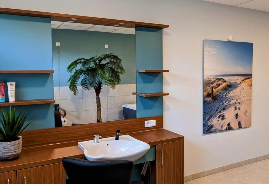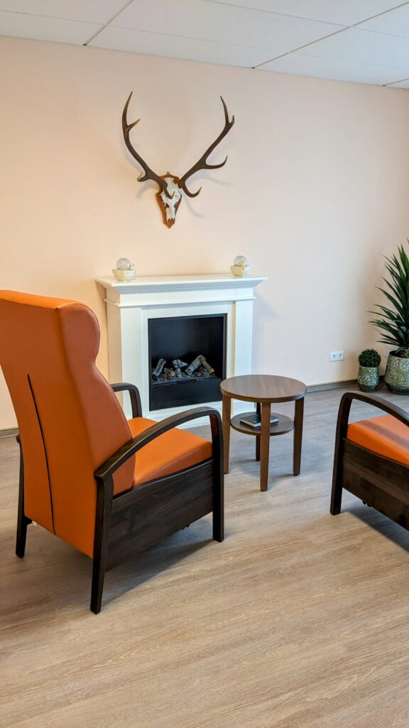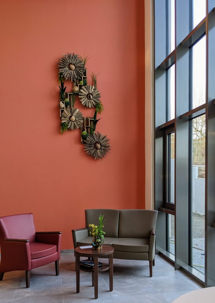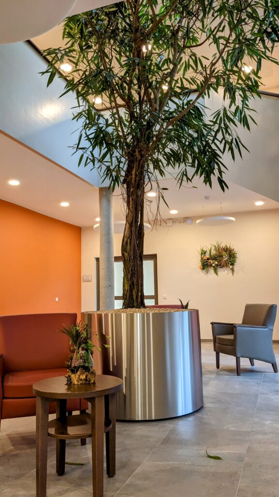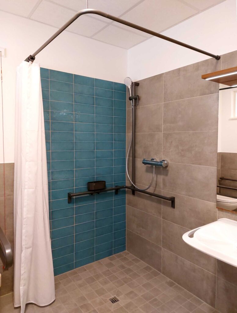 Dadurch ist das Obergeschoss direkt an die Straße angeschlossen. So sind die Gästezimmer, der Gemeinschaftsbereich, sowie die Räume zur Entspannung und des Abschiedes ebenerdig über den Flur bei der Einfahrt erreichbar. Die Einzelzimmer haben jeweils einen eigenen Balkon und sind nach Süd-West ausgerichtet.