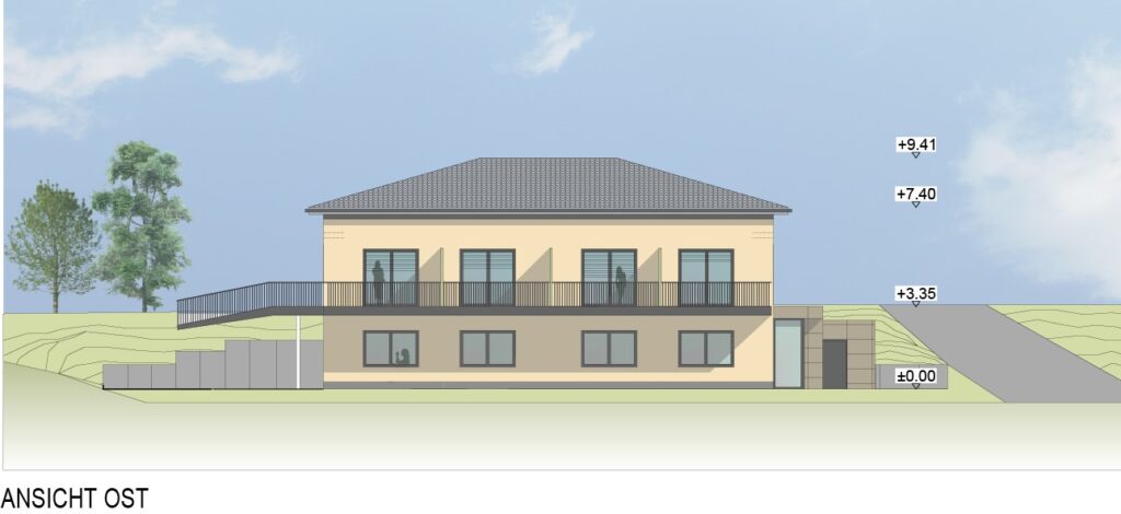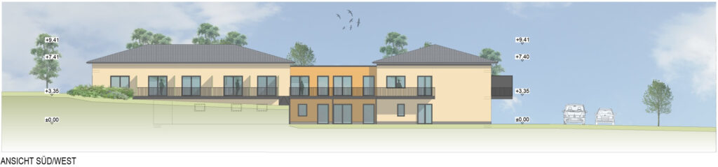 Das RJ Planungsbüro* realisiert mit dem Bauherr Internationales Bildungs- und Sozialwerk unweit der Schauenburghalle in Schauenburg-Hoof einen zweigeschossigen Neubau in Hanglage, welcher im Obergeschoss die Gästezimmer mit großen Balkonen, nach Süden hin orientiert, anordnet.